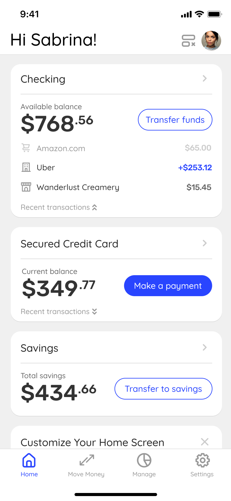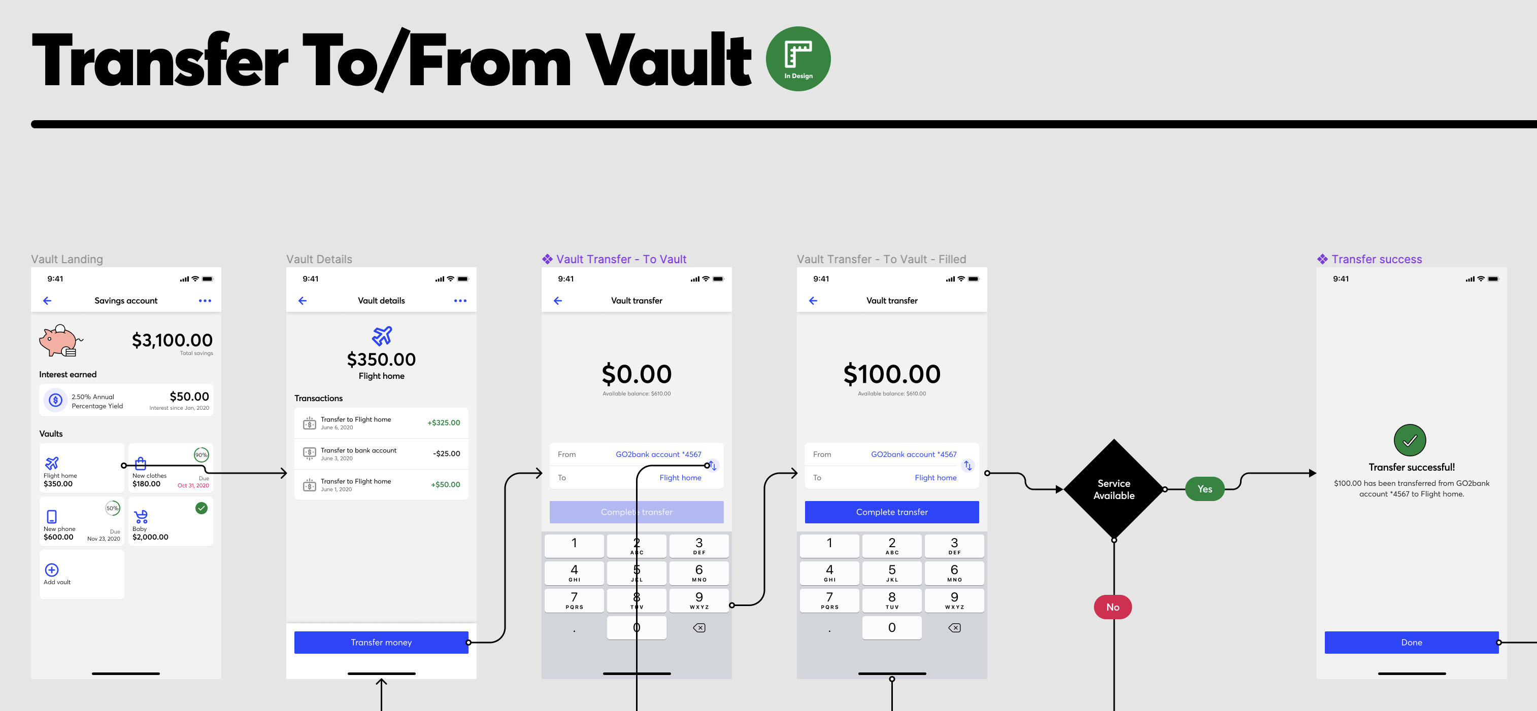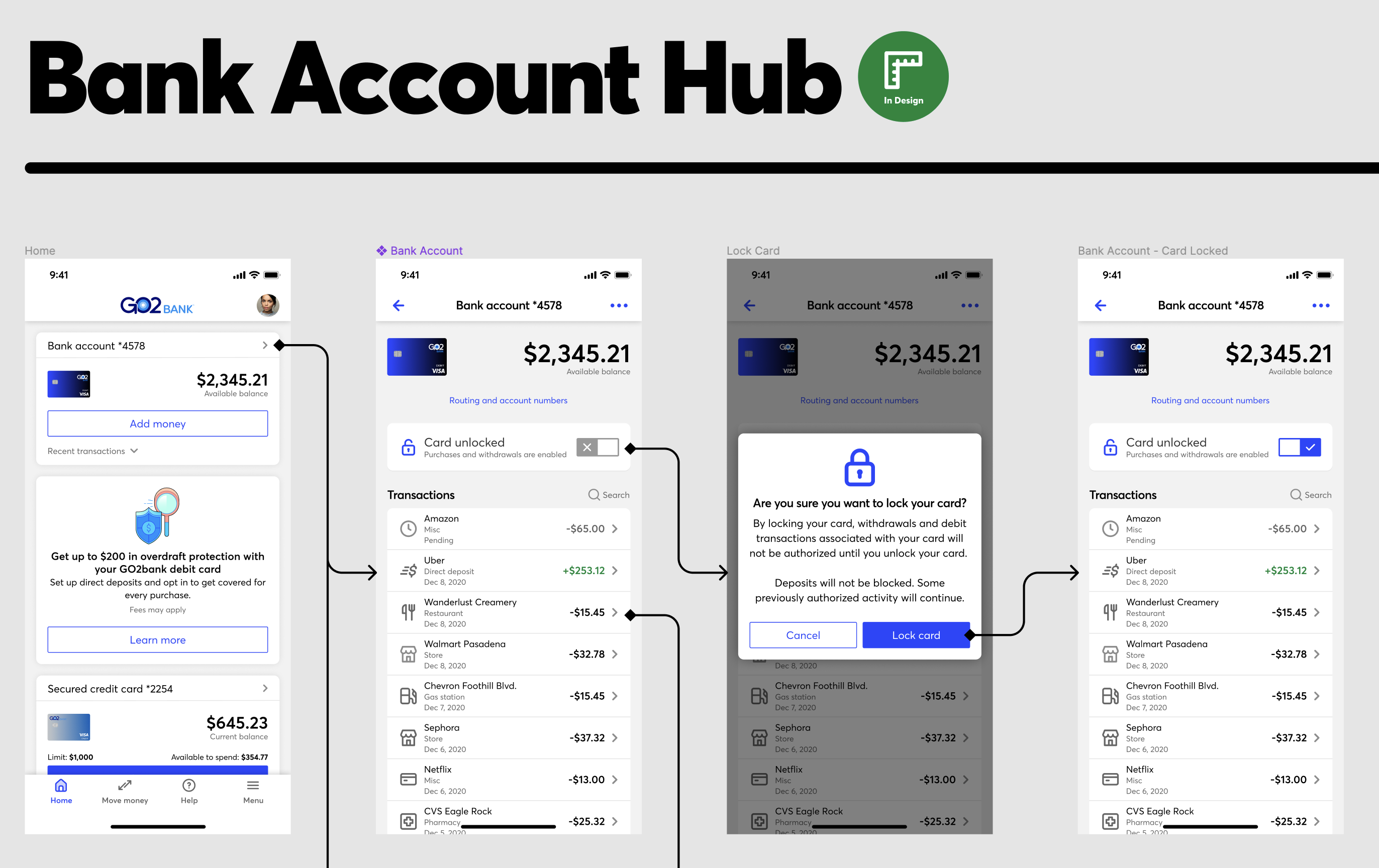 Once we had a baisc set of features and navigation structure, the design team set out to come up with various concepts, get feedback internally and then user test them for qualitative and quantitative results. Below is one of my concepts that ended up being merged with another, and becoming the final GO2bank look.